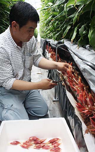 【写真説明】ビニールハウスでミョウガを収穫する成定さん