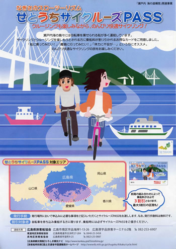 パスの有効期間は3日間。発行場所は、尾道港や三原港、竹原港、広島港、尾道駅観光案内所、くれ観光情報プラザなど17カ所。各地で自転車を借りられるレンタサイクルでの乗船も割引の対象となる。