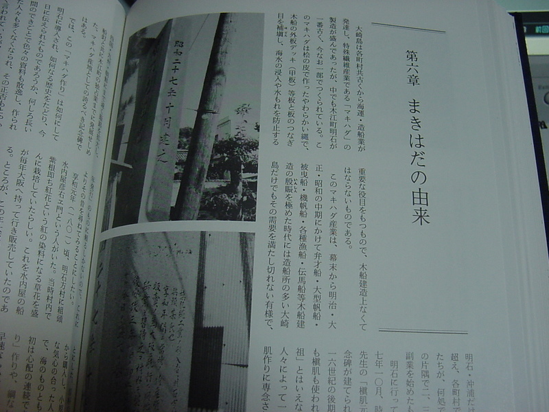 このマキハダ産業は、幕末から明治・大正・昭和の中期にかけて弁才船・大型帆船・被曳船・機帆船・各種漁船・伝馬船等木船建造の殷賑を極めた時代には造船所の多い大崎島だけでも、その需要を満たしきれない有様で、明石・沖浦だけでもその従業員が300人を越え、各町村でも造船所の近くのおばあさんたちが、何処で誰に教えてもらったのかの納屋の片隅で二,三人が集まり、マキハダないの副業を始めたものである。
