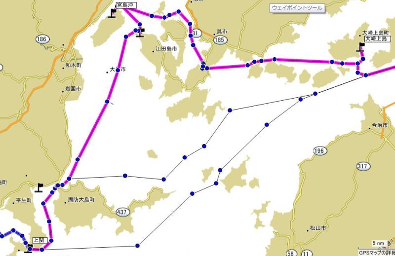 山口 上関から 大畠瀬戸 → 広島湾 → 厳島(宮島) → 音戸瀬戸 → 蒲刈沖 を通り、広島 大崎上島までの航海です。