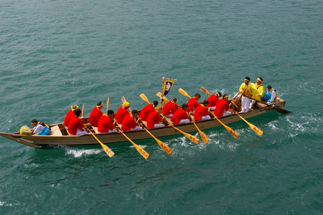 この写真の船が「櫂伝馬」です。人が漕ぐとは思えない早さで進みます。