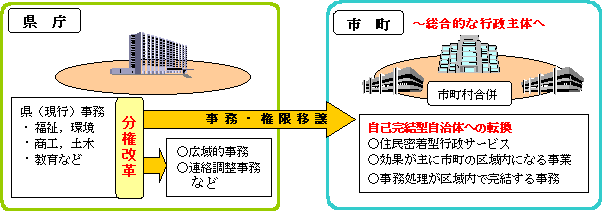 広島県では,住民に身近な基礎自治体(市・町)が地域の実情や住民ニーズに沿った行政サービスを自主的・総合的に実施できるよう,「分権改革推進計画」(計画期間:平成17年~21年)に基づき,基礎自治体(市・町)への大幅な事務・権限の移譲に取り組んでいます。